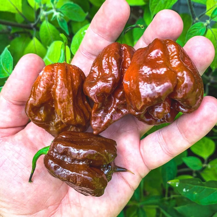 Le piment Trinidad Scorpion Chocolat est une redoutable variété originaire de Trinité-et-Tobago, issue d’une sélection du célèbre piment Trinidad Scorpion Moruga, réputé pour ses records de piquant. Sa version « chocolat » (ou brown) se distingue par sa couleur brun foncé à maturité et ses arômes encore plus complexes.